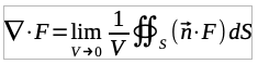 先解釋散度。指向球外的法線分量為正值,指向球內的法線分量為負值。分量的數值是通過這一點的通量(flux)。將球面所有點的通量相加是球面的通量。將通量除以球體積,並將r縮小。當r趨近於0,就成為球心這一點的散度。