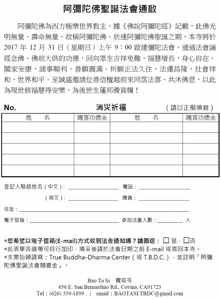 阿彌陀佛為西方極樂世界教主,據《佛說阿彌陀經》記載,此佛光明無量、壽命無量,故稱阿彌陀佛。欣逢阿彌陀佛聖誕之期,本寺將於2017年12月31日(星期日)上午9:00啟建彌陀法會,通過法會誦經念佛、佛前大供的功德,回向眾生吉祥免難,福慧增長,身心自在,闔家安康,諸事順利,善願圓滿。祈願正法久住,法運昌隆,社會祥和,世界和平。至誠盛邀諸位善信檀越前來同霑法喜、共沐佛恩,以此為現世修福慧得安樂,為後世生蓮邦備資糧!#第三世多杰羌佛 #佛教正法中心 #美國洛杉磯寶塔寺