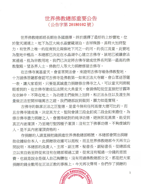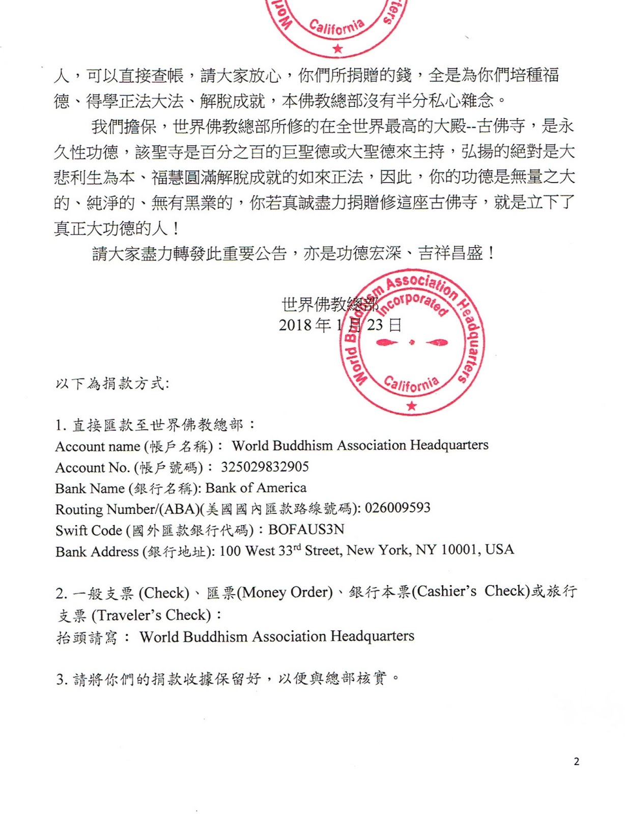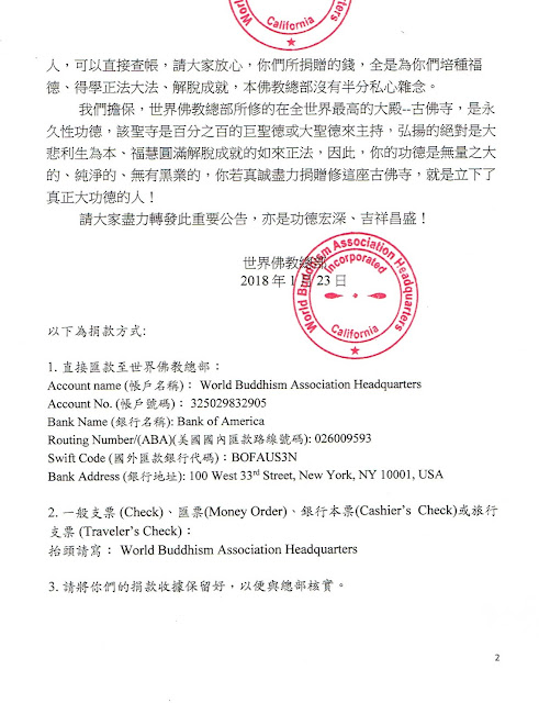 作捐贈的人請直接把錢捐進世界佛教總部帳號, 本總部會開出捐贈款收據給你本人,此捐贈款收據可以抵稅。 而且世界佛教總部今天再次公開說明,本總部的負責人、主席、 副主席、秘書長、副秘書長, 從總部成立以來自始至終從來沒有在總部領過工資, 從來沒有報過一分錢的差旅費,也就是說全是個人自己掏腰包, 沒有用過佛教總部分文, 都是把大家捐贈的錢全數用在正法正教的事務上。今天再次聲明, 你們作了捐贈的人,可以直接查帳,請大家放心,你們所捐贈的錢, 全是為你們培種福德、得學正法大法、解脫成就, 本佛教總部沒有半分私心雜念。