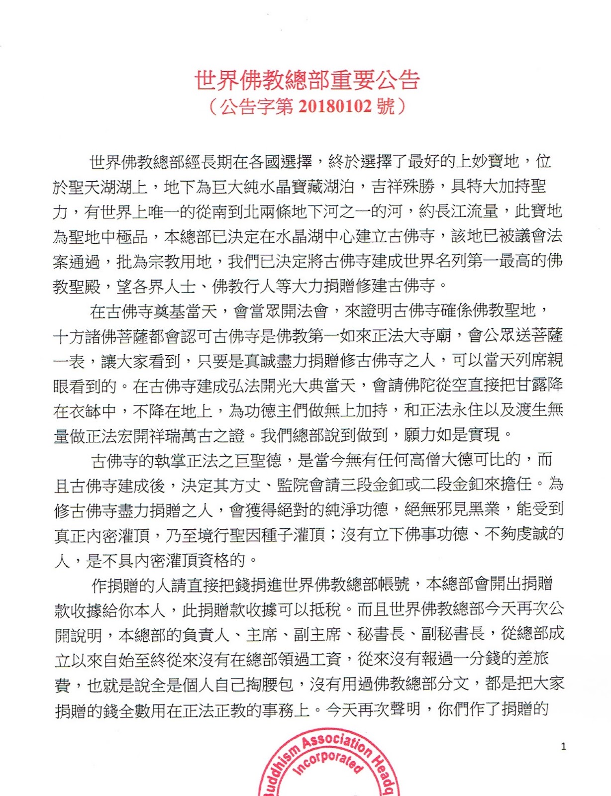 世界佛教總部經長期在各國選擇,終於選擇了最好的上妙寶地, 位於聖天湖湖上,地下為巨大純水晶寶藏湖泊,吉祥殊勝, 具特大加持聖力,有世界上唯一的從南到北兩條地下河之一的河, 約長江流量,此寶地為聖地中極品, 本總部已決定在水晶湖中心建立古佛寺,該地已被議會法案通過, 批為宗教用地, 我們已決定將古佛寺建成世界名列第一最高的佛教聖殿, 望各界人士、佛教行人等大力捐贈修建古佛寺。