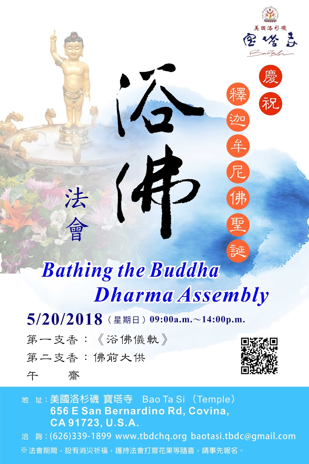 二千多年前,佛陀降生時,大地震動,九龍以清香之水灌沐佛身,寶幢華蓋,自然顯現,種種殊勝瑞相,慶讚世尊聖誕。經云:「於佛滅後當至心念佛無量功德之力。浴佛形像如佛在時。得福無量不可稱數。」又云:「浴佛形像福報所生。常得清淨。從是因緣得成佛道。」為恭祝娑婆世界佛教教主南無本師釋迦牟尼佛佛誕,本寺特於2018年5月20日(星期日)上午9:00啟建浴佛法會,屆時將誦經、讚佛、行浴佛之禮以為供養及慶祝,祈請諸佛加持眾生,消災免難,離苦得樂,功德回向一切大眾,福慧增長,吉祥如意。歡迎十方善信蒞臨法會,同霑法喜!