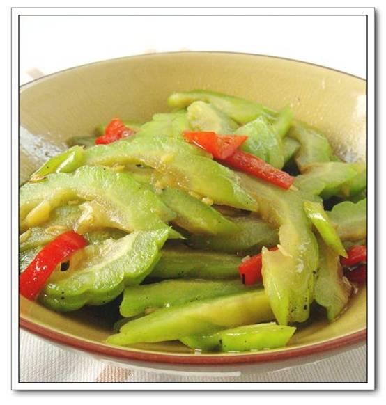 做法:1、苦瓜去蒂切成兩半,去籽洗淨後切成簿片,加少許鹽醃一下,除去水分;紅尖椒切成小段。2、起鍋熱油,倒入苦瓜片用旺火爆炒2分鐘,出鍋裝碟。3、另起鍋熱少許油,加入薑末、辣椒段,爆香,倒入炒過的苦瓜片,淋上少許醬油、鹽、白糖、醋,用旺火煸炒2分鐘,即可出鍋。提醒:苦瓜片一定要用旺火爆炒。關於苦瓜:1、苦瓜雖苦,卻不會把苦味傳給其他的菜。2、有降血糖作用,是糖尿病患者理想的食療食物。3、經常食用可提高人體免疫能力。