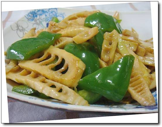 2、起鍋熱油,油略多些,倒入筍尖煸炒,邊煸邊淋些水,待筍煸至七、八成熟時,倒入醬油、白糖、蘑菇精調味,並放入菜椒,略炒後即可出鍋。