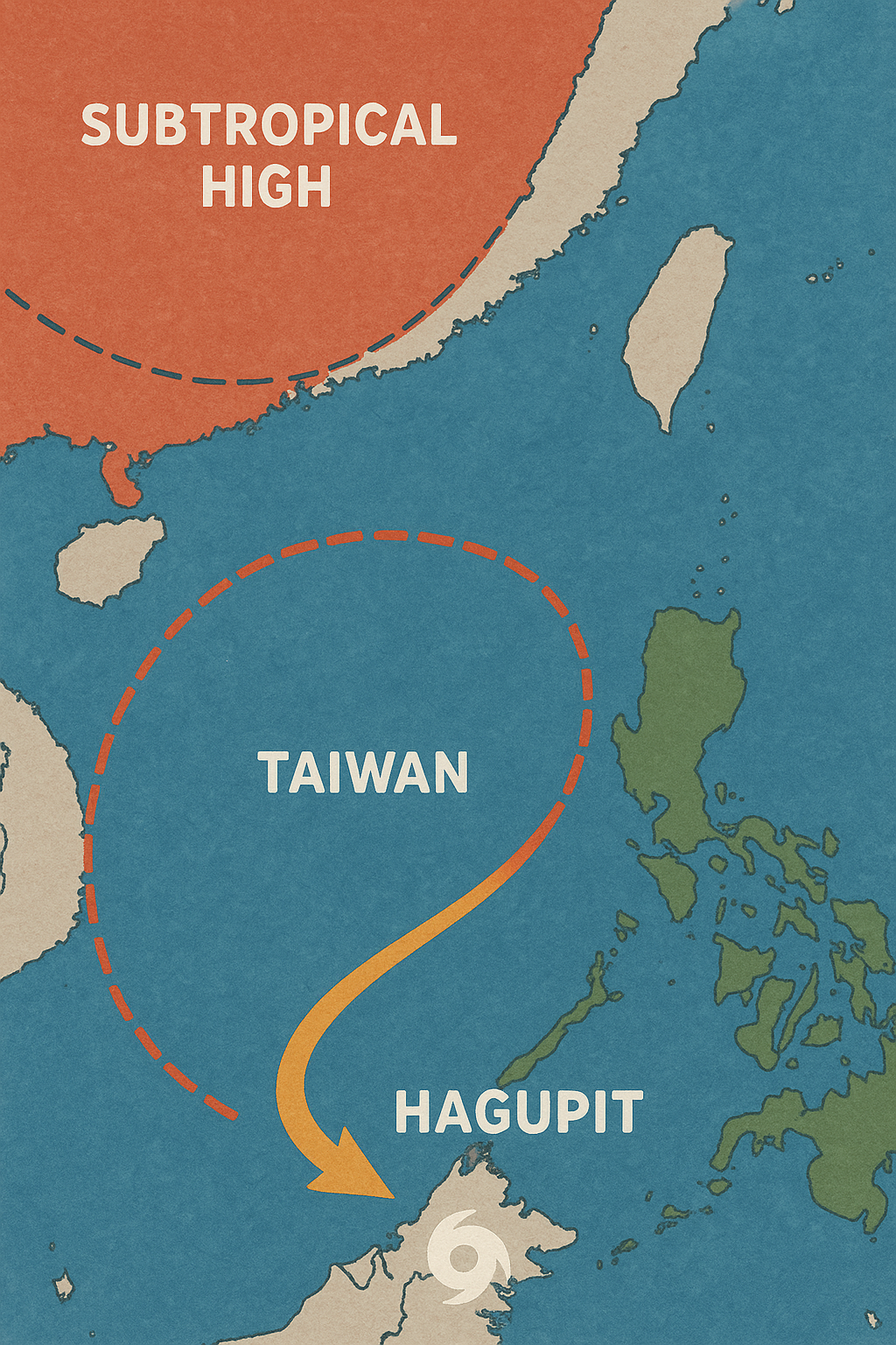 Chatgpt 很搞笑: 畫一張 樺加沙颱風路徑受副熱帶高壓與台灣地形影響示意圖?