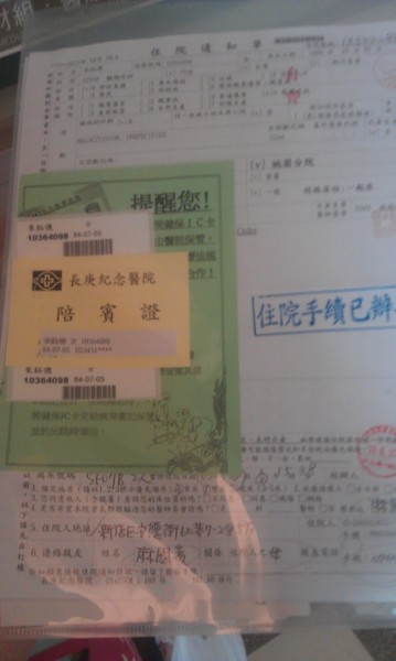 大約下午三點多先到1F大廳辦理住院手續,再到5F護理室登記,到護理室時護士會測血壓、量體溫、問家庭病史、成員,總之就是詳細到根本身家調查。由於今天是我爸陪我來住院,但先前名字都是簽我媽的,所以我爸所有資料都塗掉重寫,後來醫院還會給妳簽一張輸血同意書,反正我不能經手所以我樂得開心(未滿20)。