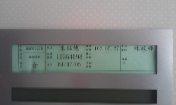 102.05.27早上9點多接到醫院的通知,下午4點前要到醫院報到,很幸運的是,拿到了雙人房,住院這四天來,雙人房=單人房,完全沒人入住。
