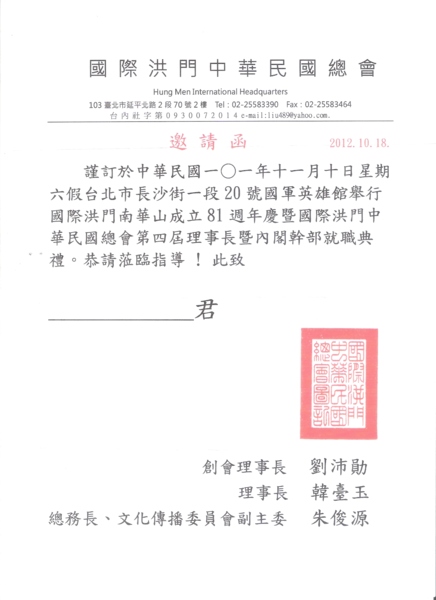 國際洪門總會週年慶暨洪門南華山81週年慶,101年11月10日 假台北市國軍英雄館舉行,懇邀各界賢達参加;洪門南華山下午四點開香堂;國際洪門總會週年慶於17:30開始,各界黨政軍要員蒞臨指導。地址:台北市長沙街20號