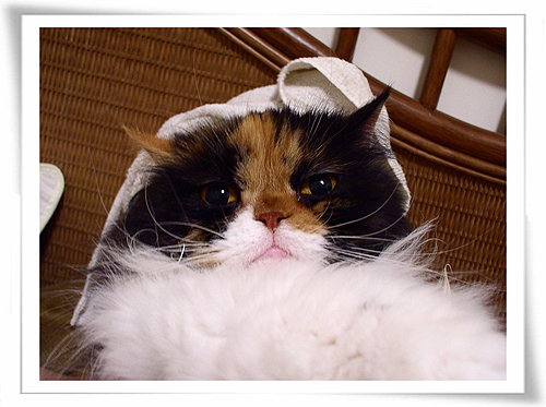 雖然她有一些小小的缺點卻是我的寶,一個小寶貝,每次跟老公吵架不說話,陪著我的是她,回來撒嬌也是她!看到她不管幫她洗澡還是做任何事都覺得好幸福,因為第一次養貓,不知道動物一些疾病問題(她不喜歡我們幫她清耳朵)在一次的清耳朵中(2005年8月8日)我們偒害到她,立刻送醫!醫生告訴我們要小心這几天是危險期,但我老公10日出國而我13日也要去帶團,多麼緊張耽心,但一天一天的好起來本想沒問題。。誰知在8月12日那天一聲尖叫!我可愛的女兒離開了我(送醫已經來不急了)我哭的好傷心好傷心(但不敢哭太久,明天要帶團眼睛腫腫的怎跟客人解釋,只能強忍淚水)三天後回到家中那種落陌感,我不敢坐在客廳裏,都躲到房間怕處景傷情,而我常想我那可愛女兒是故意的,因怕我難過所以挑一天她老爸老媽都要帶團的日子,讓他們都沒時間痛苦難過!可是二年了只要看到她可愛的照片,我都會忍不住流下眼淚,希望再找到一隻跟她很像又可愛的貓。。希望!