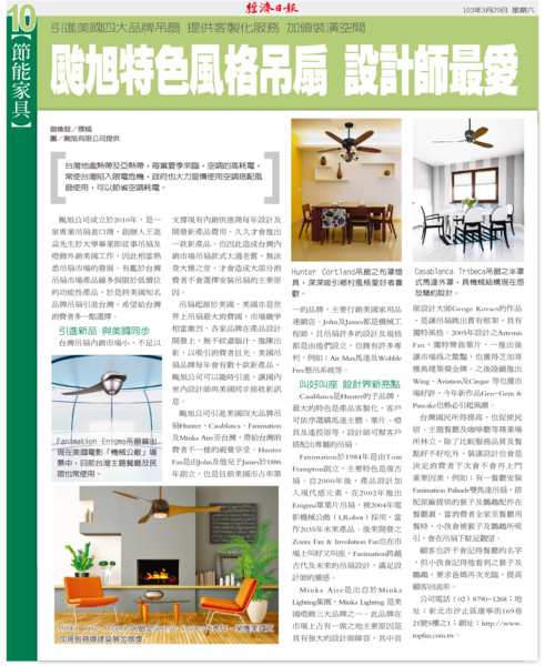 吊扇起源於美國,美國亦是世界上吊扇最大消費國,市場競爭相當激烈,各家品牌在產品設計開發上,無不絞盡腦汁,推陳出新,以吸引消費者目光。美國吊扇品牌每年會有數十款新產品,颱旭公司可以隨時引進,讓國內室內設計師與美國同步接收新訊息。