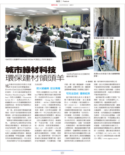 城市綠材科技股份有限公司經多年技術交流與實驗測試,於104年4月28日在台北世貿舉辦研討會時,正式引進美國愛達荷州Hamilton Manufacturing,Inc.(簡稱hmi)的防火紙纖棉(Thermolok InCide PC),此產品由再生木╱紙纖維與100%天然硼酸鹽經高科技處理而成,常用於室內裝修時之隔間填充材料使用。