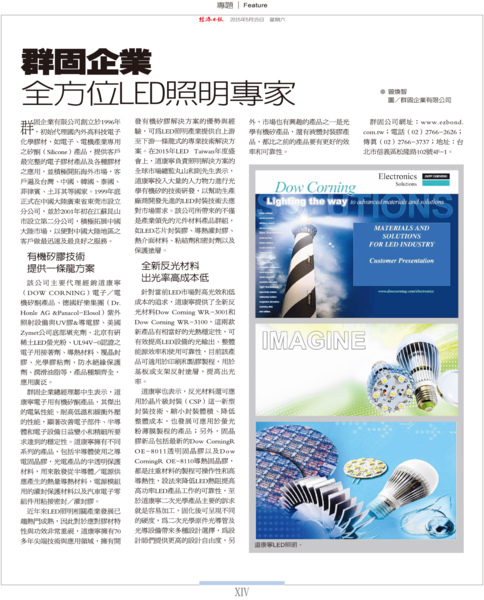 群固企業總經理鄒中生表示,道康寧電子用有機矽酮產品,其傑出的電氣性能、耐高低溫和緩衝外壓的性能,顯著改善電子部件、半導體和電子設備日益變小和精細所要求達到的穩定性。道康寧擁有不同系列的產品,包括半導體使用之導電固晶膠,光電產品的半透明保護材料,用來散發從半導體╱電源供應產生的熱量導熱材料,電源模組用的灌封保護材料以及汽車電子零組件用粘接密封╱灌封膠。