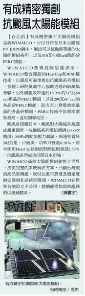 有成精密旗下太陽能模組品牌WINAICO,3月2日將在日本太陽能PV EXPO展中,展出可以抗颱風等級的太陽能模組系列,以及315瓦60個cell單晶矽PERC模組。