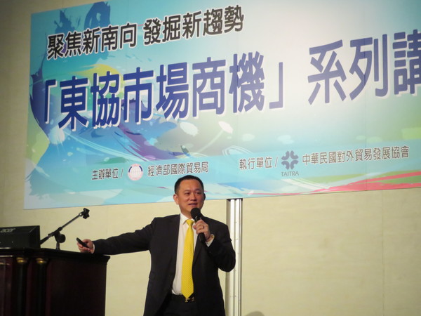 泰國外商聯合總會康樹德主席在「東協-泰國市場發展趨勢及商機」講座演講。曾煥智∕攝影