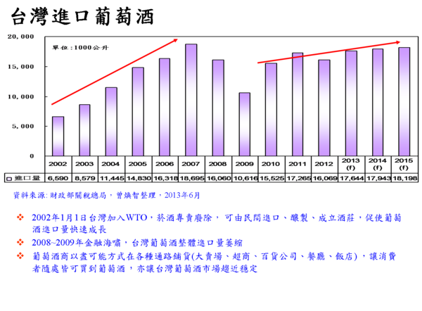 1.2002年1月1日台灣加入WTO,菸酒專賣廢除, 可由民間進口、釀製、成立酒莊,促使葡萄酒進口量快速成長