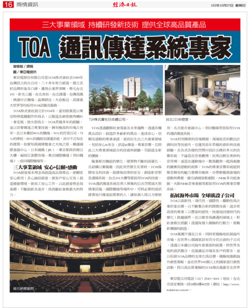 東亞電股份有限公司是TOA株式會社在1989年台灣設立的分公司,二十多年努力經營,建立良好品牌形象及口碑,獲得企業界青睞。舉凡台北101、新光三越、台北車站、台北捷運、台灣高鐵、桃園中正機場、晶華酒店、大倉飯店、高雄義大世界等均採用TOA設備及服務。