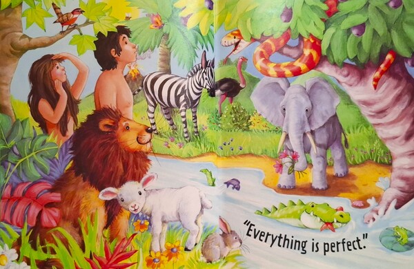 在第六天,神創造了男人:「你的名字是亞當。」又創造了女人:「你的名字是夏娃。」神開設了美麗的伊甸園讓兩個人居住,並且交待:「好好照顧我所造的一切吧。」第七天,神休息了。衪看著自己所造的一切,就說:「真好,所有都是最美好的。」