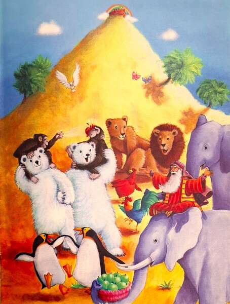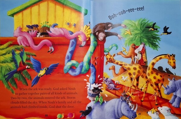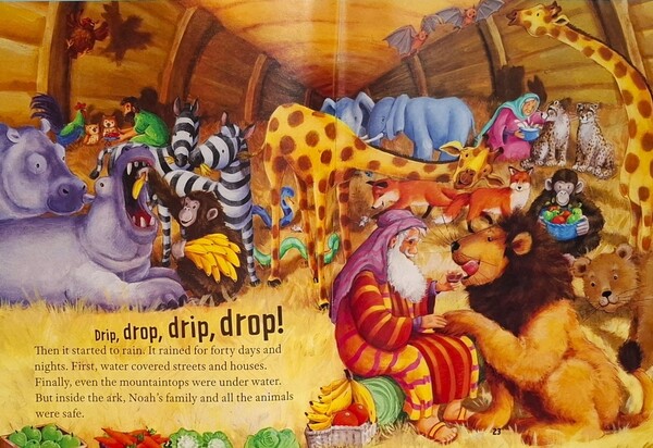 這時候,暴風雲堆滿天,諾亞的家人和所有動物都進入方舟,神關上方舟的門。「滴答,滴答!」開始下雨了,下了四十天。一開始,水淹過街道和房屋,後來連山頂都在水面下。不過在方舟裡的諾亞家人和動物們都是安全的。