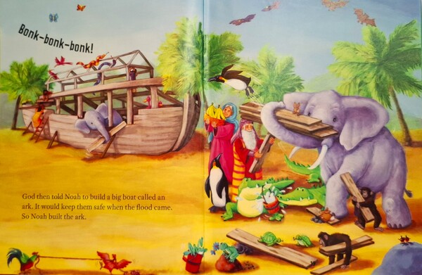 《挪亞方舟》時間走著走著。有一天,神看著所造的世界,衪非常哀傷。因為所有的人都忘了神,而且都在做壞事。神想到衪的朋友–諾亞,諾亞是個會傾聽神說話的好人。神對諾亞說:「我有個計畫,我要一切從頭來過。將會有暴風雨和洪水沖走所有罪惡,不過你和家人都會安全」神要諾亞建造方舟,當洪水來的時候可以保護他們。