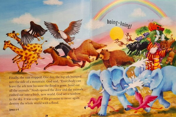 最後雨停了。有一天,方舟在一座山頂停住了。神說:「大家可以離開方舟了,洪水走了,讓動物出去吧。」諾亞打開方舟的門,「波音!波音!」袋鼠夫婦跳出方舟,船上所有動物一起衝向全新的世界。神在天空放上彩虹,代表衪不再用洪水毁滅世界的承諾。