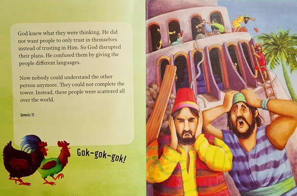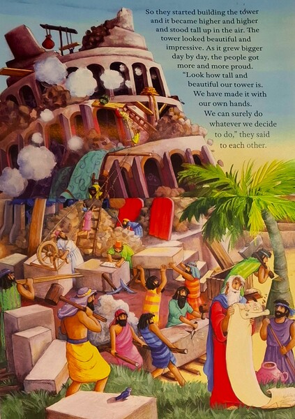 神知道人們的想法,衪不要人們不相信神,只相信自己。神就打亂人們的計畫,衪讓人們說不同的語言,因而就產生困擾了。再也沒人聽得懂別人在說什麼。高塔當然完成不了,人們也分散到世界各地,因為你說你的,我說我的,沒法溝通啊,好像雞同鴨講:「咯咯咯,啊啊啊!」