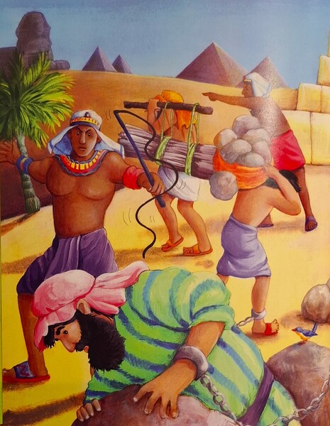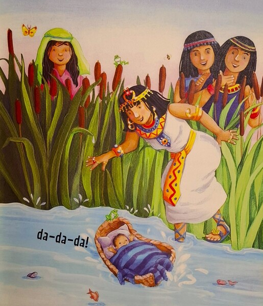 《籃子裡的嬰兒摩西》在埃及有一位壞心的法老王,他強迫以色列人做奴隸,為他建造美麗的宮殿。他說:「以色列人太多了。」他害怕以色列人會變更強大,所以就命令士兵去找出以色列男嬰並丟進河裡。