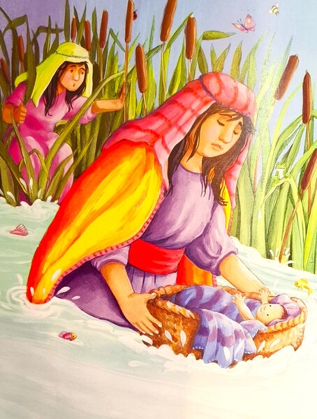 有一位以色列母親剛生下一個男嬰,非常害怕地哭起來,她對女兒說:「我們一定要把你的弟弟藏起來,不要被壞法老王和士兵找到。」她們就將男嬰放進竹籃子裡,然後藏在尼羅河邊的蘆葦叢中,姊姊米利暗就躲在附近偷看。