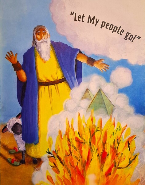 《神呼召摩西》摩西在埃及長大,到年老時就逃走了,他對法老王把以色列人當奴隸感到憤怒。有一天,摩西看見非常奇妙的事,有荊棘灌木叢燒起火來,但葉子沒有燒掉,神就透過荊棘烈火來說話:「摩西,你要去幫助我的百姓,回埃及和你哥哥亞倫去跟法老王說,讓我的百姓離開。」