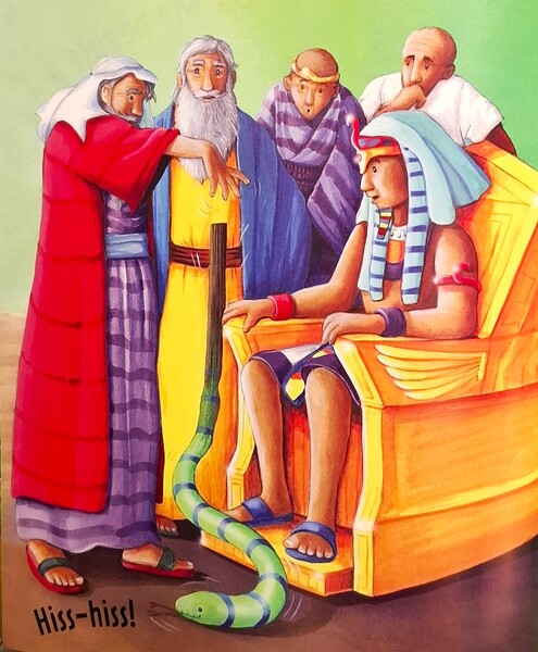摩西去見法老王:「讓以色列人走吧,讓他們找到一處新的地方居住。」神也給了亞倫神奇的手杖去證明給法老王看,代表是神差遣他們來做這事的。當神奇手杖丟在法老王面前時,就變成一條蛇。不過,法老王的魔術師們也將他們的手杖變成蛇。法老王大吼:「不!我永遠不會讓以色列人走的,永遠不會!」