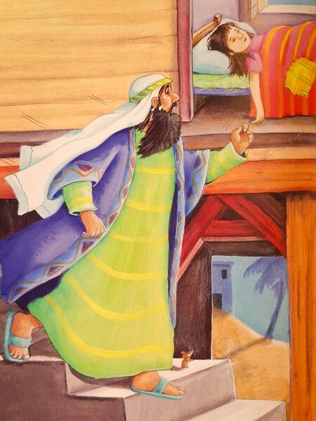在睚魯家裡,所有人都在哭:「小女兒走了。」但耶穌說:「我要叫她起來,她只是在睡覺。」旁人譏笑起來,因為很確定小女兒已過逝了。耶穌走進小女兒臥室,坐在床上,握起她的手:「醒一醒,小女孩,該起床了。」小女孩立刻張開眼睛跳下床。耶穌將她家人叫來:「給她吃早餐。」睚魯和妻子看見耶穌讓他們女兒復活,實在太驚訝了,他們衝去床邊擁抱親吻小女兒。耶穌讓他們成為最快樂的父母。因為耶穌的神蹟,女兒死而復活了。