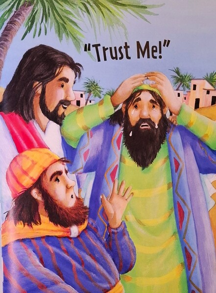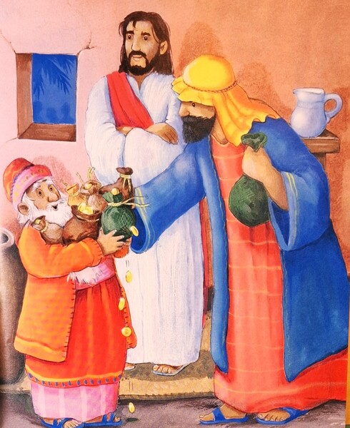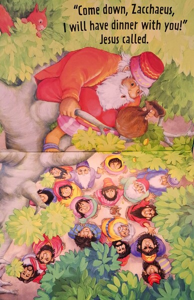 《撒該遇到耶穌》有個人叫做撒該,因為他偷取一些人的錢,所以真的沒有任何朋友。他為國王工作,負責徵收稅金,他會收取比應收還更多的錢,並將多出來的錢佔為己有,這就是為什麼人們完全都不喜歡他。有一天,撒該聽說耶穌到鎮上來,他也想去見耶穌。不過因為撒該很矮,根本什麼都看不到。