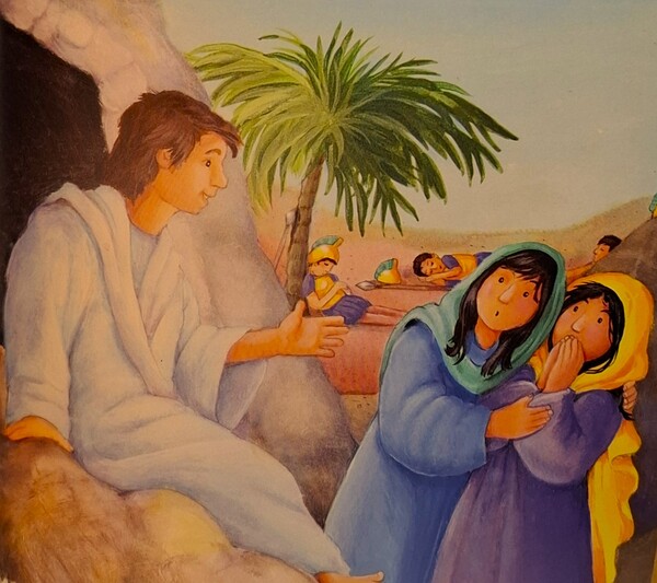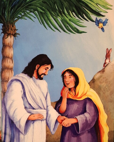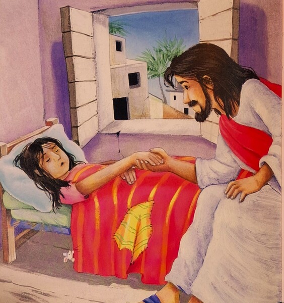 《耶穌治癒小女孩》有個人叫睚魯,他非常憂慮,因為小女兒臥病在床,身體越來越糟,沒人知道該如何讓小女兒病情轉好。睚魯想起他聽過耶穌治病的事蹟:「我知道了,我要去找耶穌,衪一定可以讓女兒再好起來。」