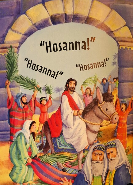 《進入耶路撒冷》當耶穌知道時候到了,衪決定前往耶路撒冷,和門徒一起慶祝逾越節。衪歡愉欣喜地進入耶路撒冷,人人都因為衪將成為他們的新王,並將羅馬士兵趕走而跳躍歡呼:「奉主名而來的是賜下福氣的,和散那!榮耀讚美獻給至高的神。」不過耶穌並不是那種世俗的君王。