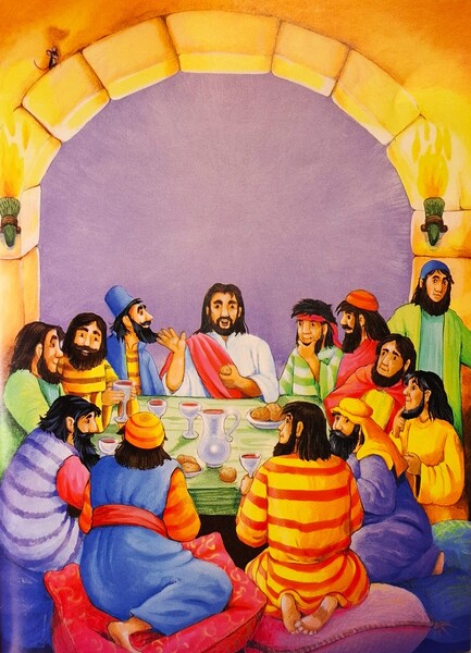 耶穌和門徒聚在一起享用逾越節餐食,耶穌將酒和麵包分享給他們,衪告訴門徒,當衪不再和他們在一起的時候,就用這種方式記得衪。不過,門徒對於將要發生在耶穌身上的事並不明白。耶穌知道,衪要離開世界、回到天父身邊的時間近了。