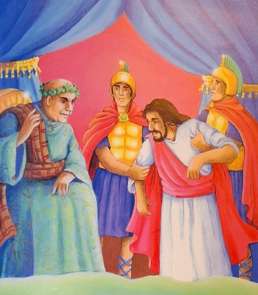 《耶穌死了》士兵帶著耶穌去見要進行審問的羅馬總督彼拉多,彼拉多問:「所以,你是一位君王?」耶穌平靜的回答:「是的,但我的王國不在這個世界上。」許多人控告耶穌的事情都不是真的,他們聚集起來大喊:「把耶穌釘死在十字架上,我們要他去死!」這是可怕的!但是完全正確的,這是神的計畫,是耶穌誕生在世上的原因。