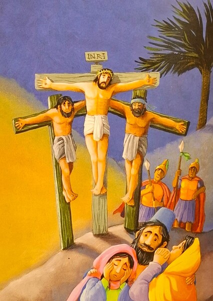 隔天,士兵們將耶穌帶去一個叫各各他的地方,把衪釘在十字架上。耶穌喘著氣說:「父啊,赦免他們吧,他們不知道他們在做什麼。」接著出現巨大的一片黑暗,耶穌喊著:「父啊,我獻上我的生命,一切完成了!」然後死了,衪完成了。耶穌拯救了整個世界,衪的一些朋友在旁邊非常悲傷的哭泣。耶路撒冷的掌權者們說:「這就是耶穌的終點了。」
