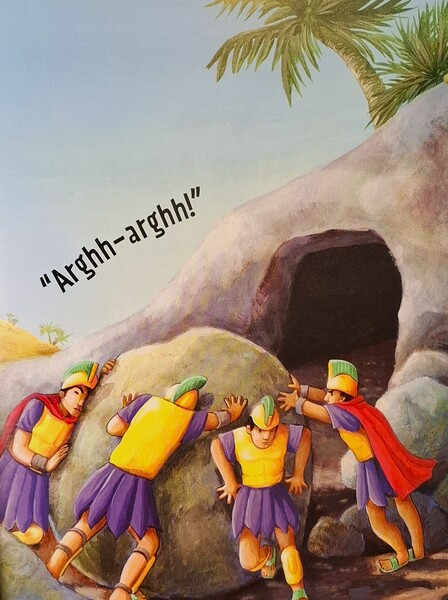 亞利馬太的約瑟要求將耶穌的遺體交給他,並且將衪葬在從未有人葬過的墳墓裡。「啊-啊!」士兵們推過來一顆巨石,擋在墳墓入口前方,就沒人可以進出了。