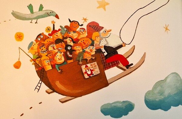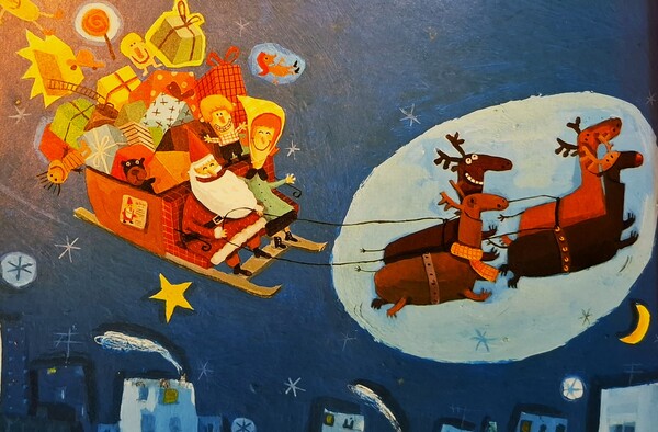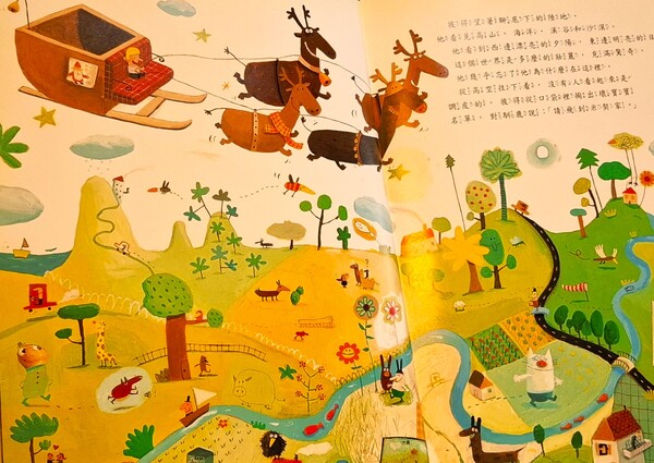 馴鹿們都很興奮,就拉著雪橇,載著彼得,飛上天空了。彼得在高空往下看著壯麗的世界,有高山、海洋、溪谷和沙漠,有美妙夕陽和燦爛日出,彼得覺得沒有一個孩子是調皮的,他看著壞寶寶名單,對馴鹿說:「請飛到米契家。」