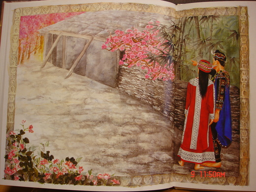 突然,這時,空中捲起了一陣旋風,「刷刷刷」,接著就看見百步蛇乘著風騰空而下,然後叼起了露古又飛回空中,向著很深很深的山林裡飛去。當百步蛇和露古在深山裡降落下來以後,突然,又是一陣旋風,「刷刷刷」,沒想到,百步蛇竟然就搖身變成了一位很帥的王子!百步蛇王子告訴露古:「對不起,因為我要保護祖先的山林,所以才會變成百步蛇,現在,請讓我好好地保護、照顧你吧!」於是他們就住進了一座美麗的石板屋裡,過著幸福快樂的日子。