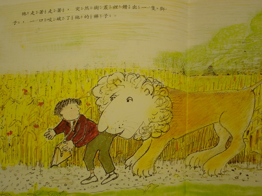 第二天急忙走路上學 (為何急忙?) ,樹叢中鑽出獅子咬破他褲子!他爬上樹躲獅子,又遲到了。老師質問他 (他會怎麼回答? 請表演)老師會不會相信? 不會,他被罰說四百遍 [不可說獅子謊和弄破褲子]。
