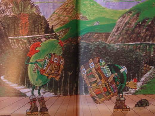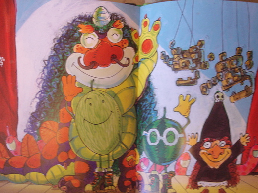 由於山路上有許多小蟲(大家學小蟲蠕動)和石頭,西瓜弟弟邊走邊叫,西瓜哥哥不停的提醒及鼓勵弟弟,走啊走的,到了半山腰,遇見了兩條叉路,經過討論後,決定一個西瓜走一邊,並用手機來連絡。分開走了以後,胖個兒哥哥遇到了大怪龍(死穴在下腹)、峭壁和紅髮巫婆, 憑著勇氣、毅力和急智,一一突破困難;同時在西瓜弟弟來電求救時,也立即告知突破秘訣,雖然西瓜弟弟也是勉強過關,但還是很沒信心,非常可惜的在就要成功前,因為害怕紅髮巫婆的狂笑狂叫,竟然還是放棄轉頭回家了!所以,從此以後,西瓜弟弟只好仍然在綿綿細雨中嘆氣,而西瓜哥哥呢,已經快樂地享受成功的感覺了!