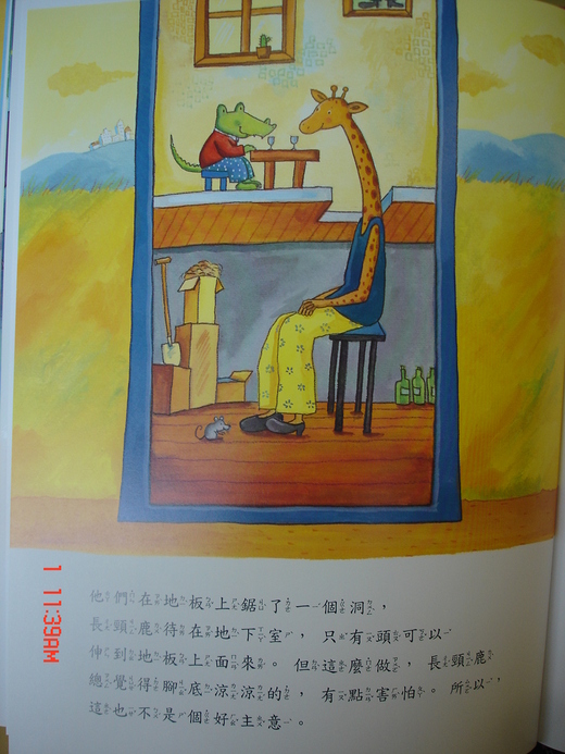 沒辦法,他們決定要搬到長頸鹿的房子,因為鱷魚的矮房子不適合長頸鹿,那長頸鹿的高房子應該會適合鱷魚吧。(你覺得會不會有什麼問題呢?)結果,還是不方便。長頸鹿的餐桌太高,鱷魚吃不到;如果換成矮餐桌,長頸鹿又吃不到。(你有想到什麼辦法嗎?)他們想到把地板鋸一個洞,長頸鹿坐到地下室,然後伸出頭來吃飯,但長頸鹿覺得腳涼涼的,有點害怕。另外,鱷魚也覺得門把太高了,樓梯太高了,他都搆不到也上不去。還有呢,馬桶太高大了,晾衣繩太高,曬衣服時,鱷魚都像在走鋼索。