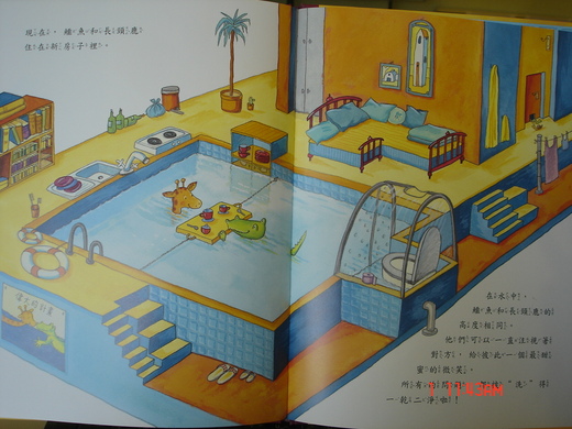 鱷魚和長頸鹿的相處愈來愈困難,只有躺在大床上時,一起躺在枕頭上,可以輕鬆地注視對方。於是,就在床上,他們想到了一個好方法。(你要不要猜猜看?)第二天,他們在花園畫出這個偉大的計畫。首先挖了一個很大的坑洞,又一起釘木板,蓋出他們夢想的居住環境。接著,一輛大型水車開來,把洞裡灌滿了水。現在他們的新房子裡,有一個大水池,中間固定著餐桌,鱷魚和長頸鹿在水中的高度都相同,可以舒服的相互注視,也可以舒服的用餐了!而且,房子的樓梯有高低兩排,雙人床也是長短兩截。從此以後,鱷魚和長頸鹿真的可以幸福快樂的在一起了。