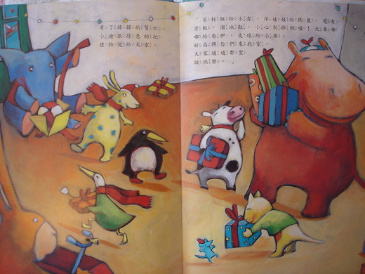 有一天下午,河馬韓韓正在睡午覺,突然,門口「咚咚咚」,是誰在敲門啊? 原來是花貓小迪要他幫忙讀信。韓韓心裡想:誰會寫信給小迪?小迪都不讓別人碰他玩具,只有我願意作他朋友。韓韓一看,是聖誔老公公寫的:「親愛的小迪,我接到你的聖誕願望,我找不到什麼又棒又刺激又能讓你開心一整年的玩具,所以今年就不來看你了,祝聖誕快樂!」小迪失望地哭起來,(現在該怎麼辦呢?) 韓韓自願為小迪寫信給聖誕老公公:「親愛的聖誕老公公,我只要新玩具就好了,我一定會開心的,玩一整年都不膩,求求你,求求你,求求你!」很快地,小迪就接到北極寄來的信,他趕緊去找韓韓來讀信:「親愛的小迪,我會給你一個不一樣的聖誕禮物,這個聖誕驚喜會讓你開心一整年哦!」小迪好開心,一直猜會送什麼特別的新玩具。聖誕節早晨,小迪跑到聖誕樹前,(你猜看到什麼?) 滿地一大堆的禮物,小迪好興奮,但是一看上面都有寫名字,而且都沒有他的名字!小迪又哭了起來:「完了完了,不知道聖誕老公公把我的禮物送到那裡去了?」河馬韓韓趕快過來安慰小迪,突然看見聖誕樹上有封信:「親愛的小迪,送禮物會帶給我,也一定會帶給你一整年的快樂,這就是我今年要送給你的禮物。聖誕老公公上」韓韓說:「原來聖誕老公公要你來送禮物,那我們就開始吧!」小迪說:「你瘋了嗎?我才不去送禮物呢!我的人緣那麼差,都沒有人喜歡我。」說完就一直哭。韓韓想了想,就回家準備一下,接著就去市中心貼邀請函,然後回小迪家。(你猜邀請函上寫什麼呢?) 突然,小迪家門口「咚咚咚」,小迪心想:會是誰呢? 一開門,哇,兔子,大象,小老鼠,鵝,牛,鹿,企鵝…大家一起喊:「聖誕快樂!」 韓韓也高興地說:歡迎光臨聖誕派對! 小迪好驚奇,搞不清楚是怎麼回事? 韓韓興奮的大喊:「聖誕節到了!」他開始叫禮物上的名字,把禮物一個一個送出去,大家好開心,只有小迪笑不出來。但是看到大家又笑又叫,小迪突然覺得這種聖誕派對也不錯…