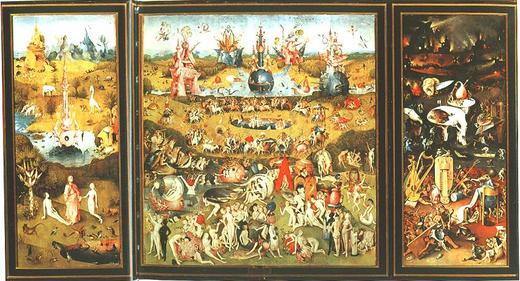 1.[人間樂園]-波西,超現實主義的老祖宗,[人間樂園]出現一些怪里怪氣的怪物,對理性不感興趣,左邊是伊甸園,下方有上帝介紹夏娃給亞當,右邊代表燃燒地獄,有人被綁在豎琴上,有怪物吃人並排洩出來;中間是樂園,裸體淫蕩不雅,多P,警示意味濃厚,真是空前創舉。(如果人們一意妄行,從左圖到中圖再到右圖,那可能再也樂不起來)