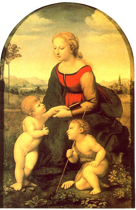 1.[聖母畫]-拉斐爾(1483-1520,得年37歲)長得俊俏,舉止優雅公子哥,有粉絲相伴,使米開朗基羅失寵,作品雲淡風清,晴朗,影響後續新古典主義;聖母畫柔美祥和無人能出其右,是聖母理想美的典型,不孕女求子的對象,相傳靈驗;將達文西的深遂幽遠改為雲淡風清,和兩人個性有關。(感覺好像聖母帶著書,為小耶穌說故事)