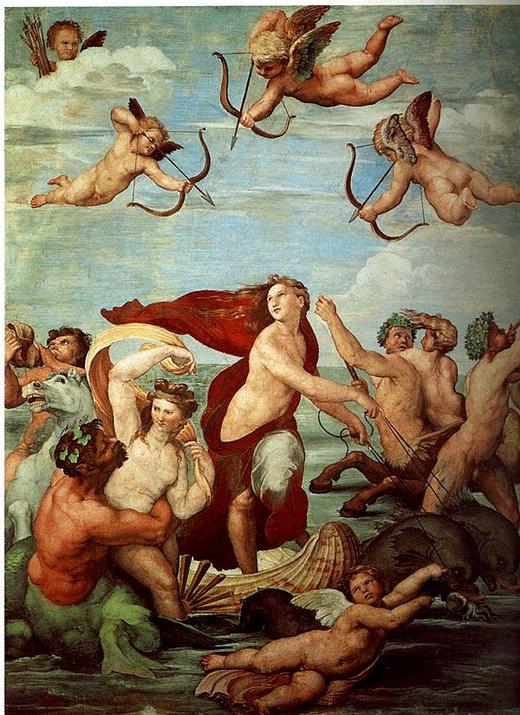 3.[GALATEA的最後勝利]-拉斐爾輕鬆有趣韻律的畫作,女神腳踩貝殼,有海豚拖著,像波利伽利的[維納斯誕生],但更自然,不光只注意線條。(是愛情戰場上的勝利嗎?)