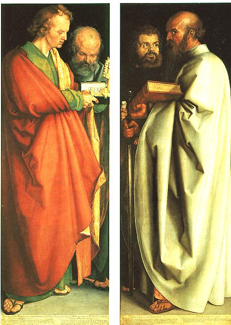 1.[四使徒]-德國的杜勒被稱為北歐的達文西,有創造力,客觀理性,[四使徒]為約翰、彼得、馬各、保羅,最左右為新教,中間兩位較小的是舊教,著重衣袍表現,顯現四種氣質,階段,季節,心情,可感受強大精神力。