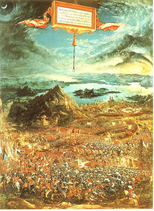 2.[伊索斯戰役]-阿爾特多佛的畫作,士兵像螞蟻,不似古典構圖,是少有的鳥瞰角度,後方有戲劇性處理,左有月,右有日,提昇為宇宙天體大戰,南方烏賽羅也喜歡畫戰役。(好比國畫中常見的天、地、人)