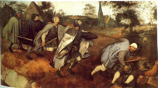 3.[瞎子的預言]-在布魯和的[瞎子的預言],取材自聖經,耶穌批評法利賽人,瞎子領瞎子,都會掉到水裡,可以和波西的諷刺畫相比較;相對於南方提高人的崇高自主,反而來諷刺人的無知愚昧。(生動有趣,令人玩味)