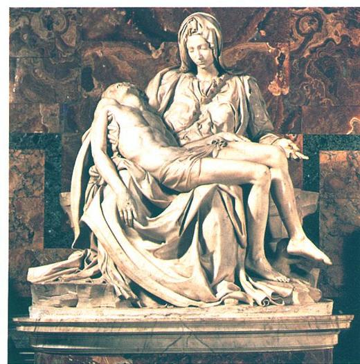 1.[聖母痛子像]-米開朗基羅(1475-1566,89歲),氣勢像山大王、野人;達文西是廣博知識,而米開朗基羅是雄渾氣魄;天才型,曾進入麥迪基家族,,24歲為教堂完成本作品[聖母痛子像],展現人性之母性,被視為兼顧神性和人性,一舉成名,是雕刻史上重大成就。